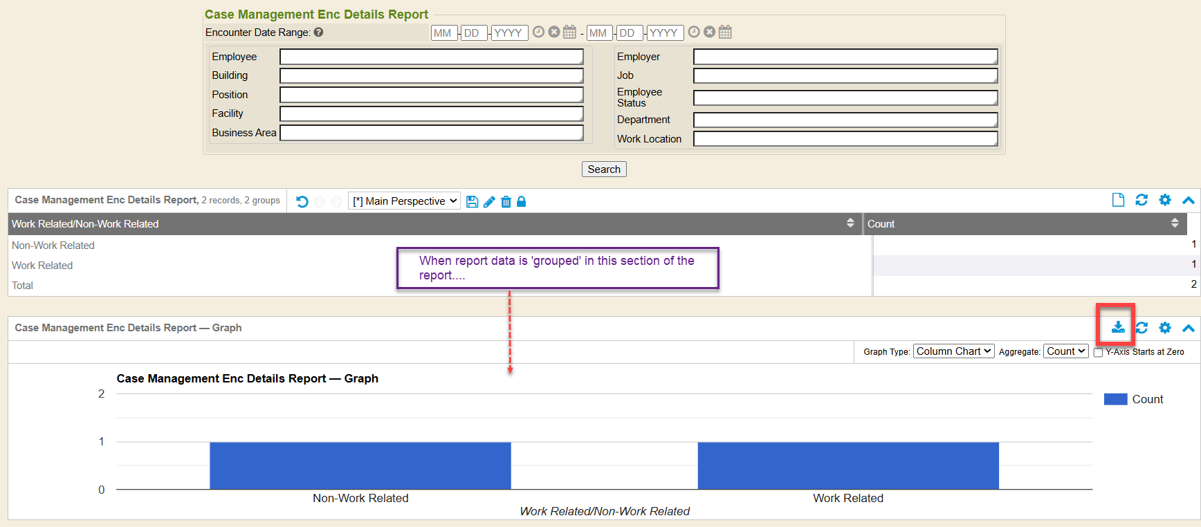 If report data in the Case Management Enc Details Report section of the output is grouped, then the subsequent section titled Case Management Enc Details Report-Graph will output a graph. The user can select the Graph Type from the drop-down to change the graph shown.